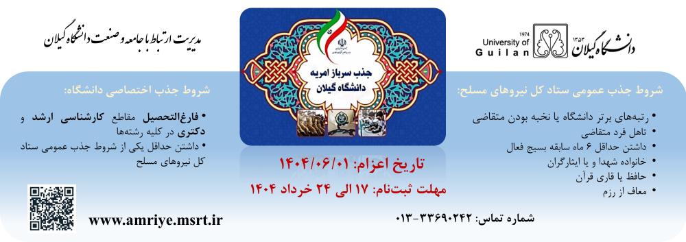 مدیریت ارتباط با جامعه و صنعت دانشگاه گیلان در نظر دارد از میان فارغ‌التحصیلان مقاطع کارشناسی‌ارشد و دکتری کلیه رشته‌ها، با تاریخ اعزام 1404/06/01 سرباز امریه جذب نماید. متقاضیان به منظور ثبت‌نام می‌توانند به سامانه ساجد به آدرس www.amriye.msrt.ir مراجعه نمایند. لازم به ذکر است، تاریخ ثبت‌نام از  1404/03/17 الی 1404/03/24 می‌باشد. همچنین متقاضیان ثبت‌نام می‌بایست حداقل یکی از شروط ذکر شده در ذیل را دارا باشند: